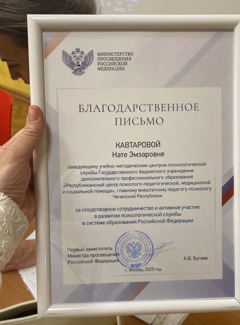 Благодарственным письмом за плодотворное сотрудничество и активное участие в развитии психологической службы региона была награждена Кавтарова Н. Э. — заведующая республиканским учебно-методическим центром психологической службы, главный внештатный психолог Чеченской Республики.